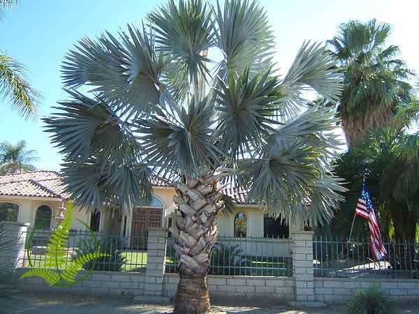 Cây kè bạc có thân trụ rễ, chùm lá xòe thùy hình quạt,có cuống dài tới 2m, đường kính khoảng 1m, lá chia thùy sâu tạo thành các phiến rộng. Tàu và lá kè bạc màu trắng bạc, tán rộng vừa phải. Kè bạc có nhiều loại phân theo ánh bạc của lá.. Bẹ lá kè bạc khá dài, có quạt lá lớn tỏa tròn chia thùy ở đỉnh bẹ. Đôi khi bạn sẽ thấy trên bẹ lá có râu tua dài mảnh buông rũ xuống dạng hình trứng trông rất đẹp mắt, thời gian sinh trưởng của mỗi bẹ lá cũng khá dài.
