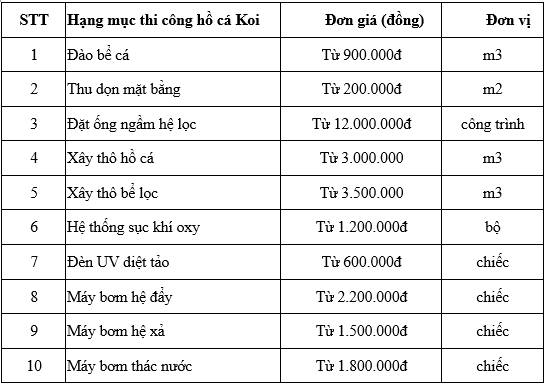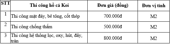 2.7. Price for construction of combined Koi fish pond